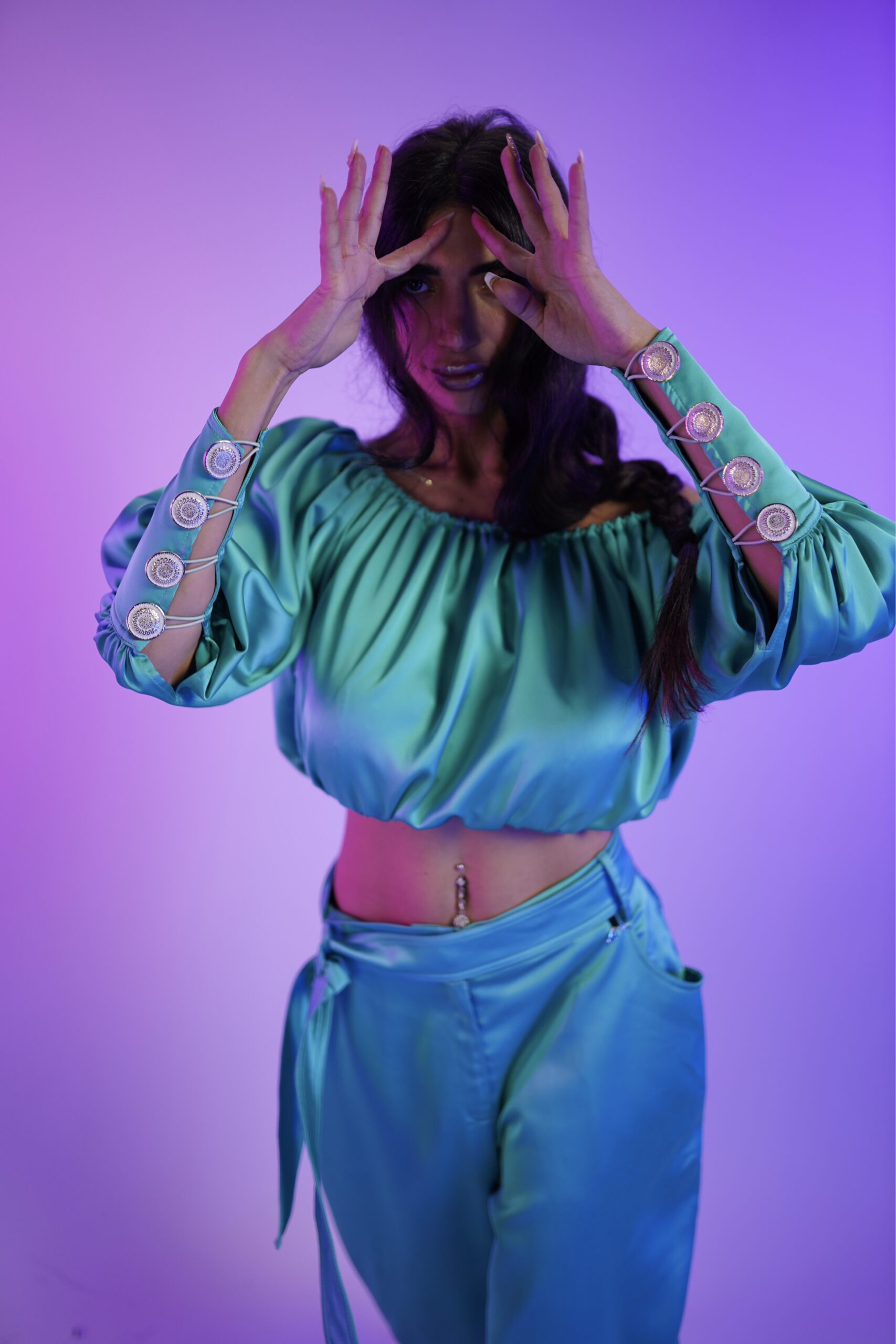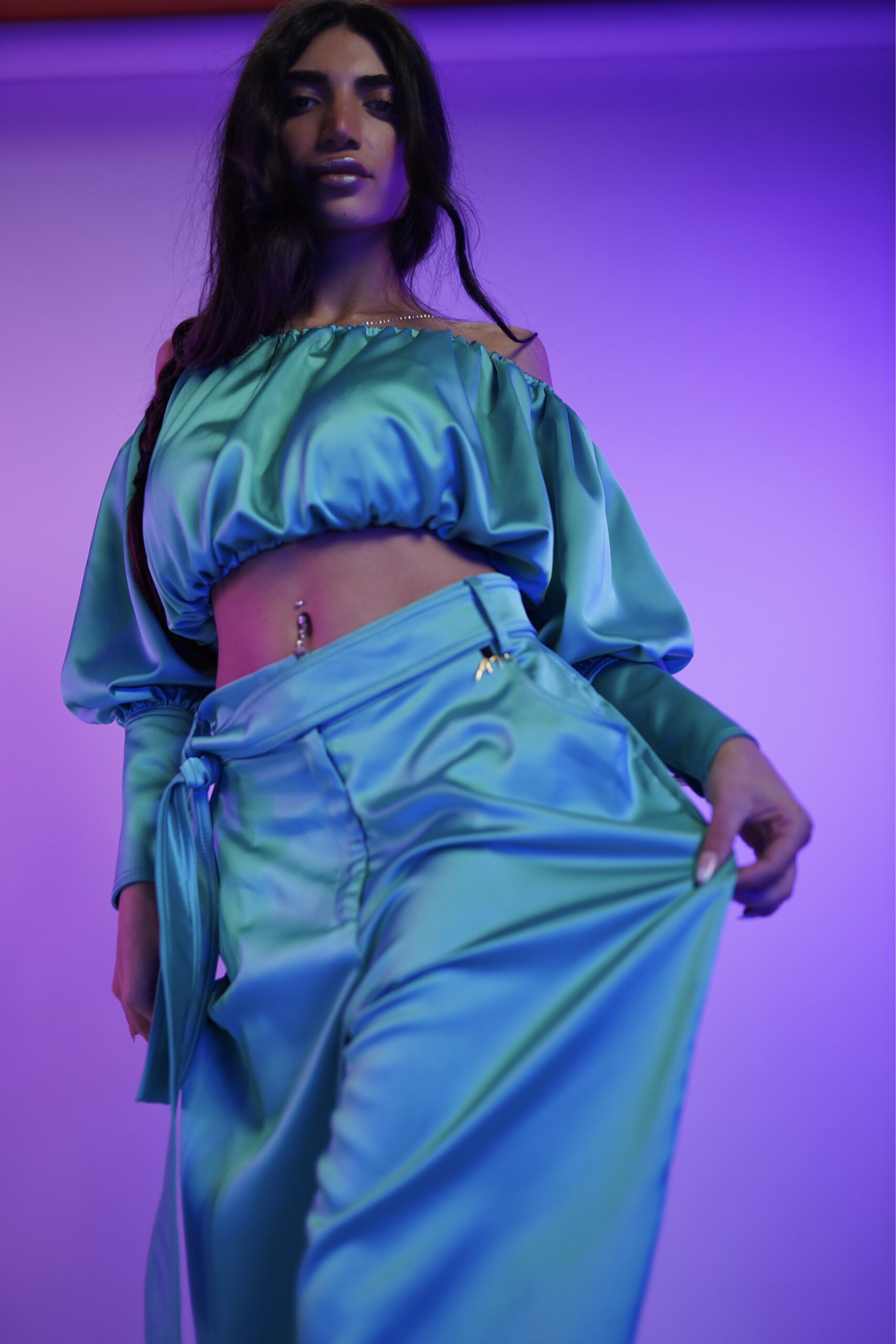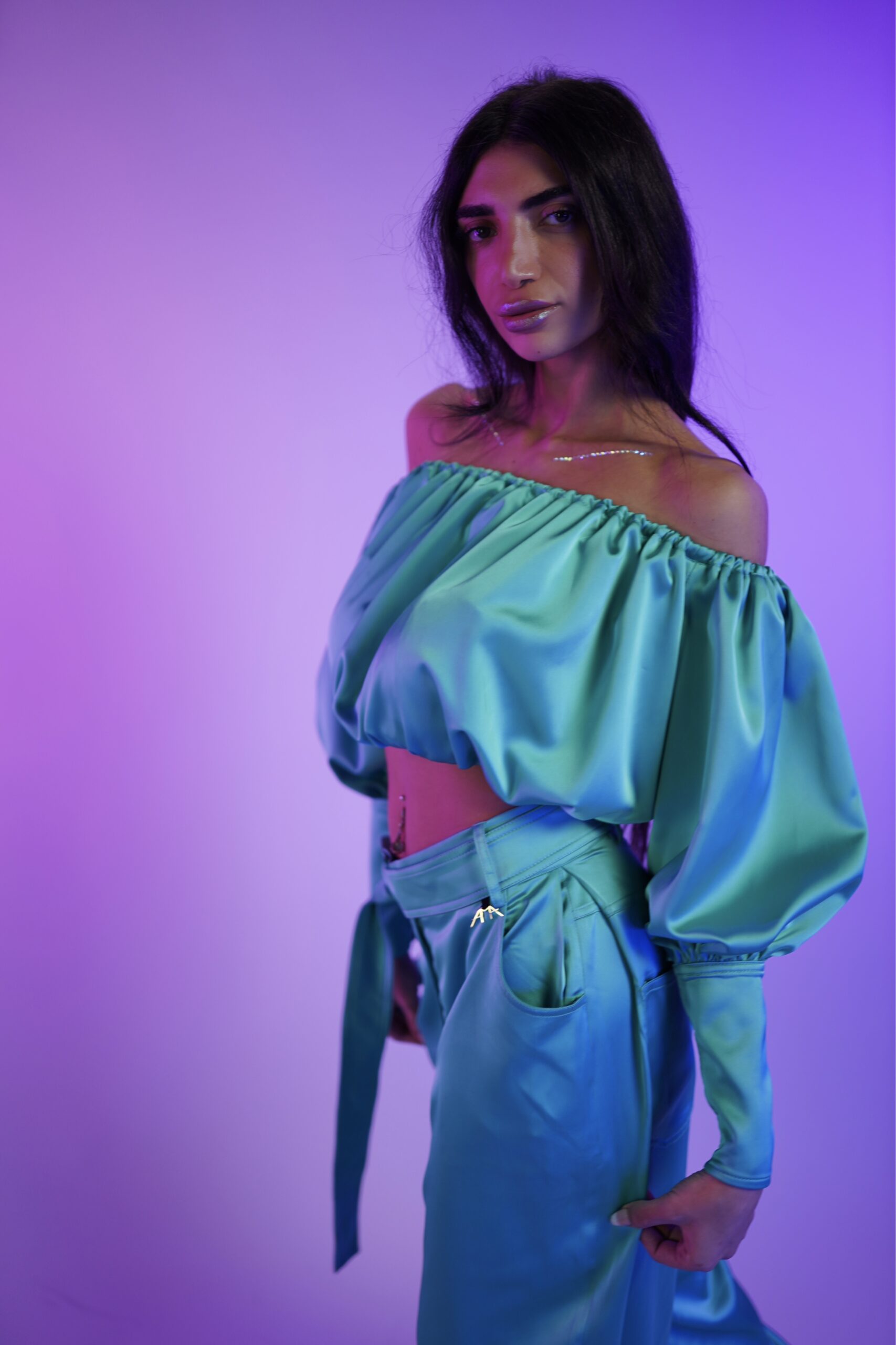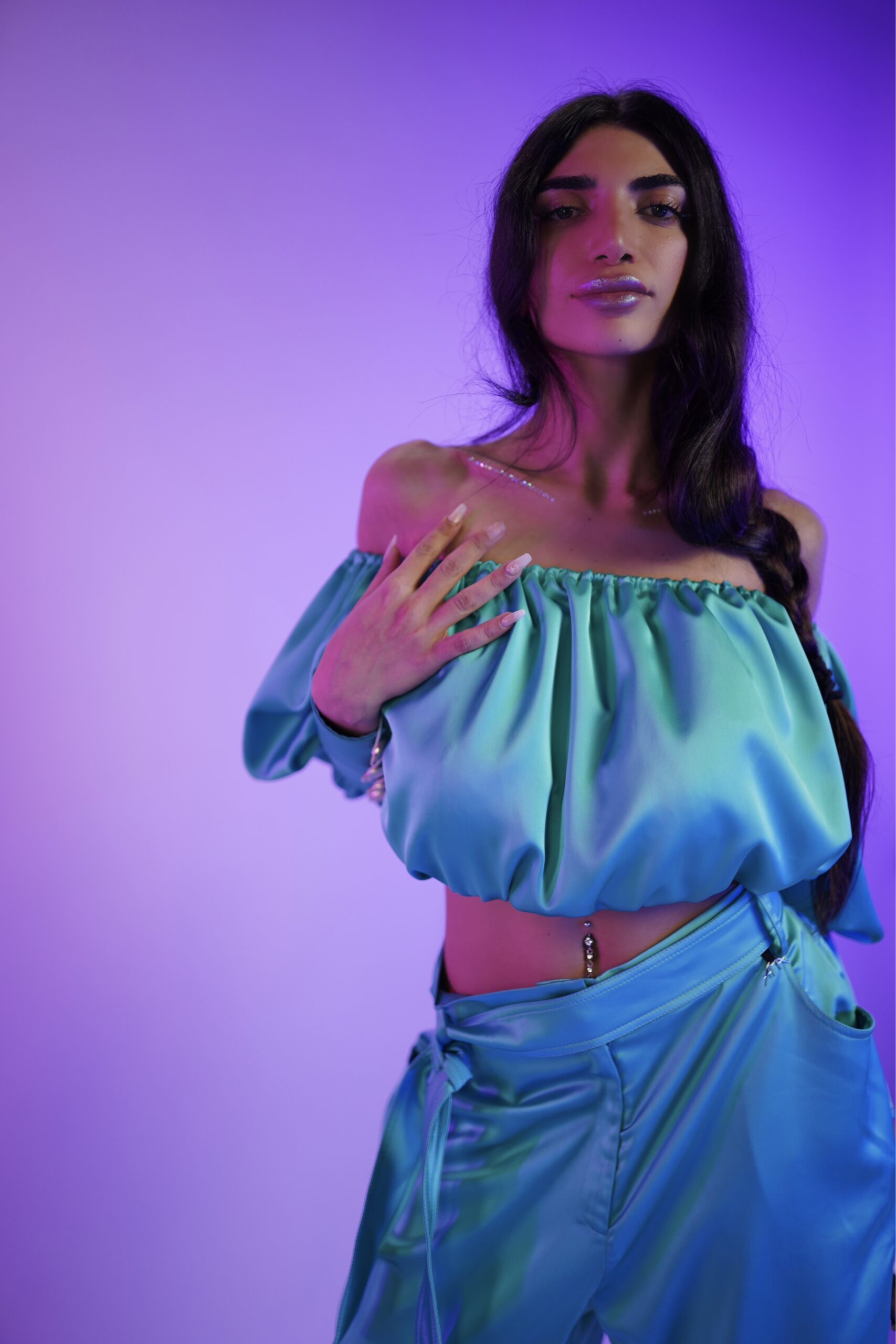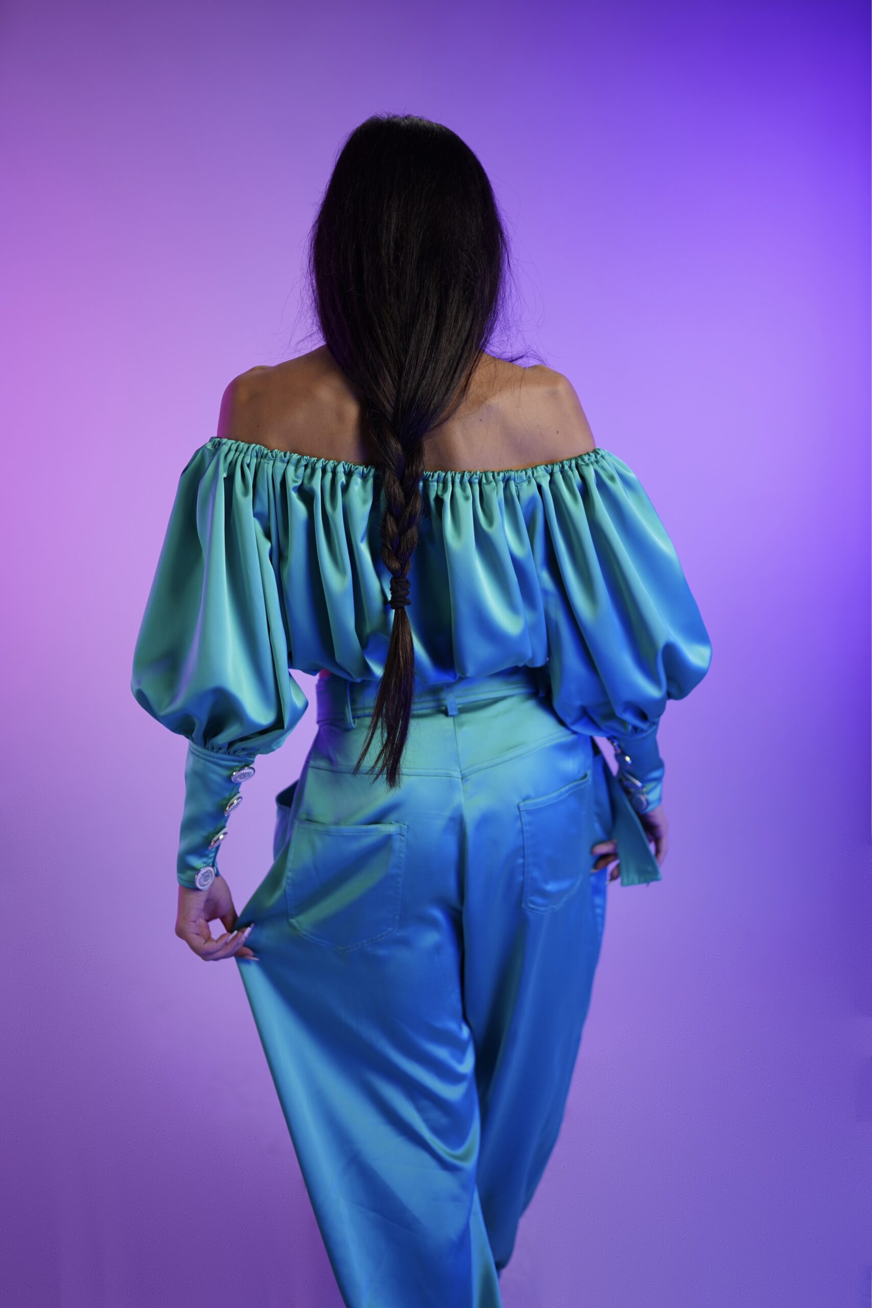 Introducing the elegant Alladine set, featuring an off-shoulder puffed top and pants adorned with charming details. This ensemble combines comfort, style, and sophistication, making it a perfect choice for a variety of occasions.
