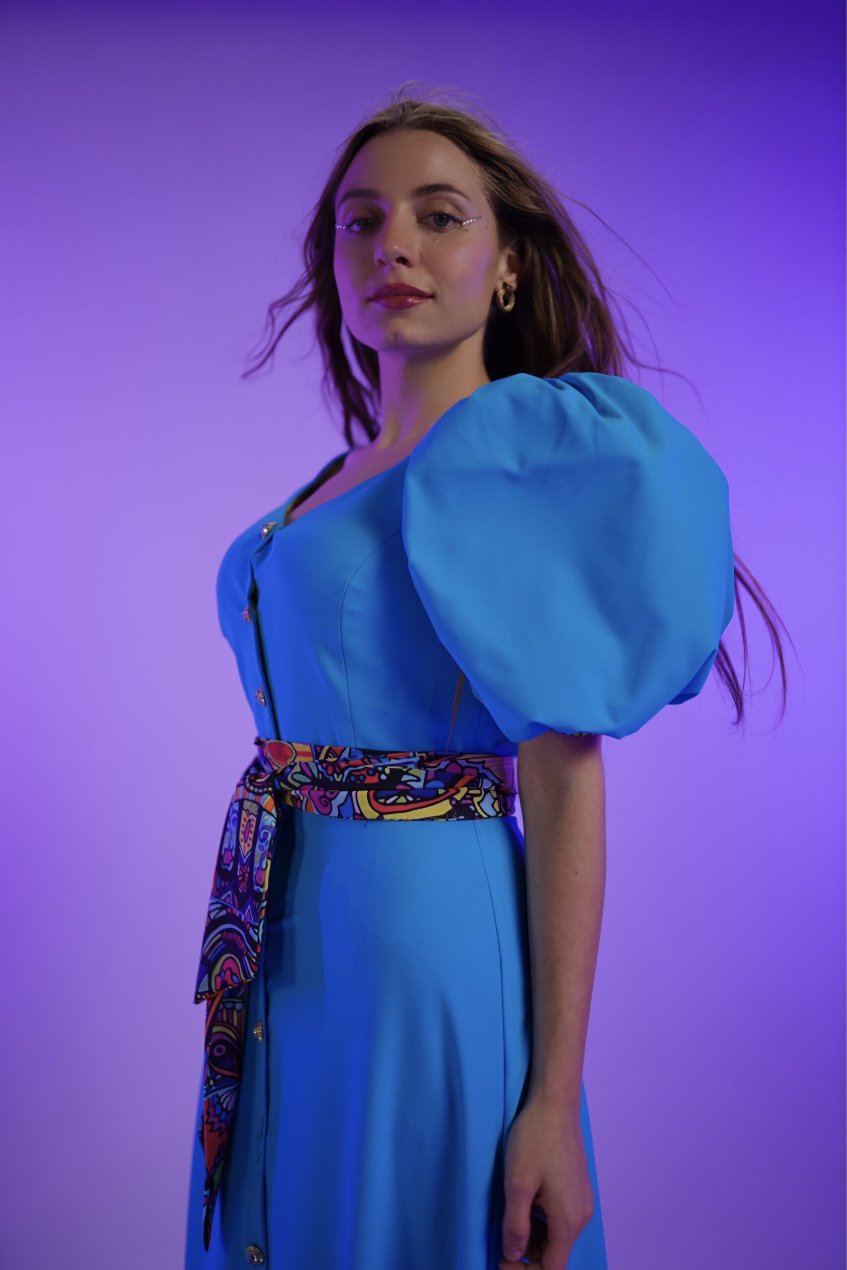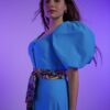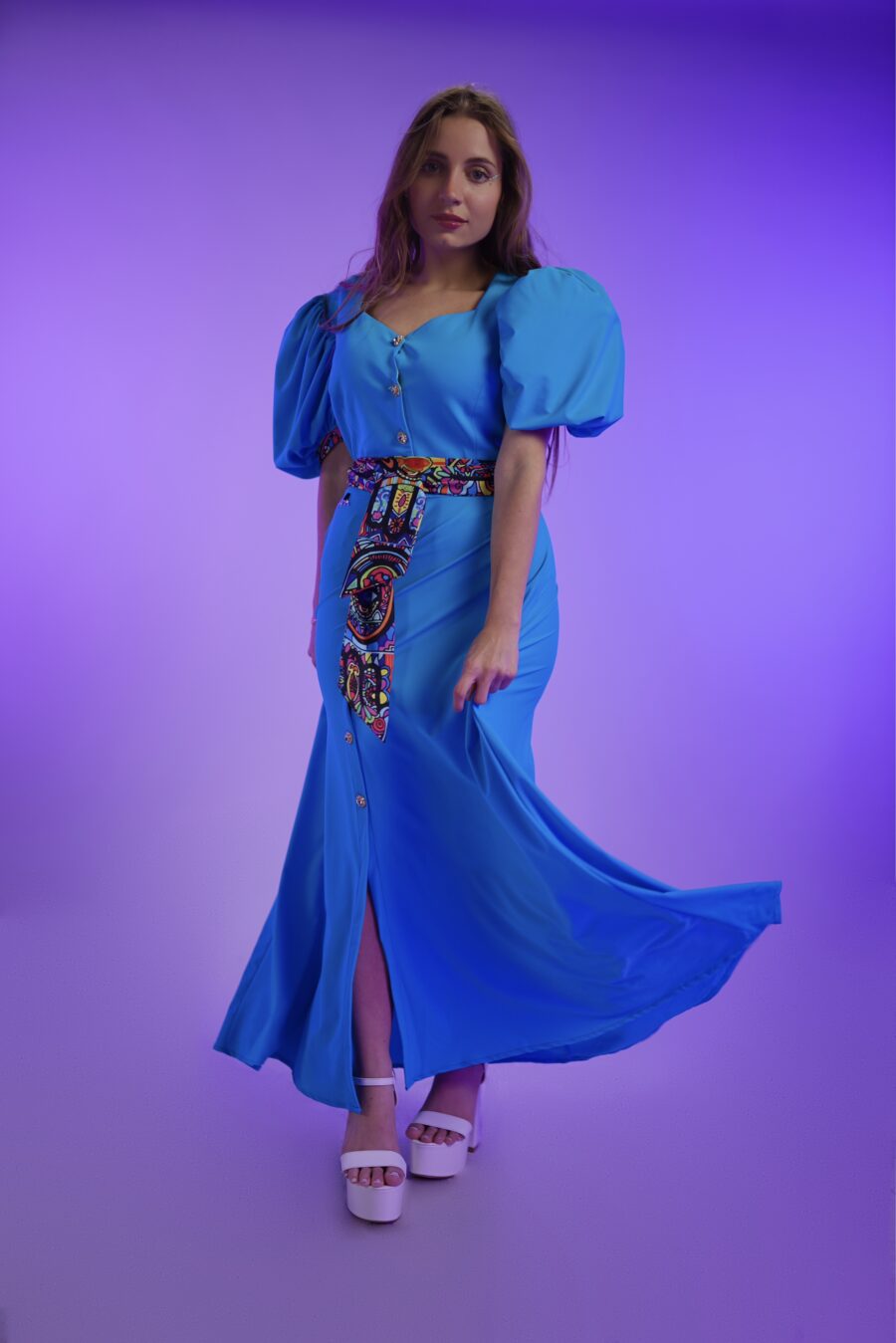 Introducing the enchanting Cinderella dress, reminiscent of a fairytale come to life. This captivating gown features exquisite details, including delicate buttons down the center, charming puff sleeves, and a beautiful ribbon belt, evoking a sense of timeless elegance.