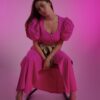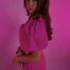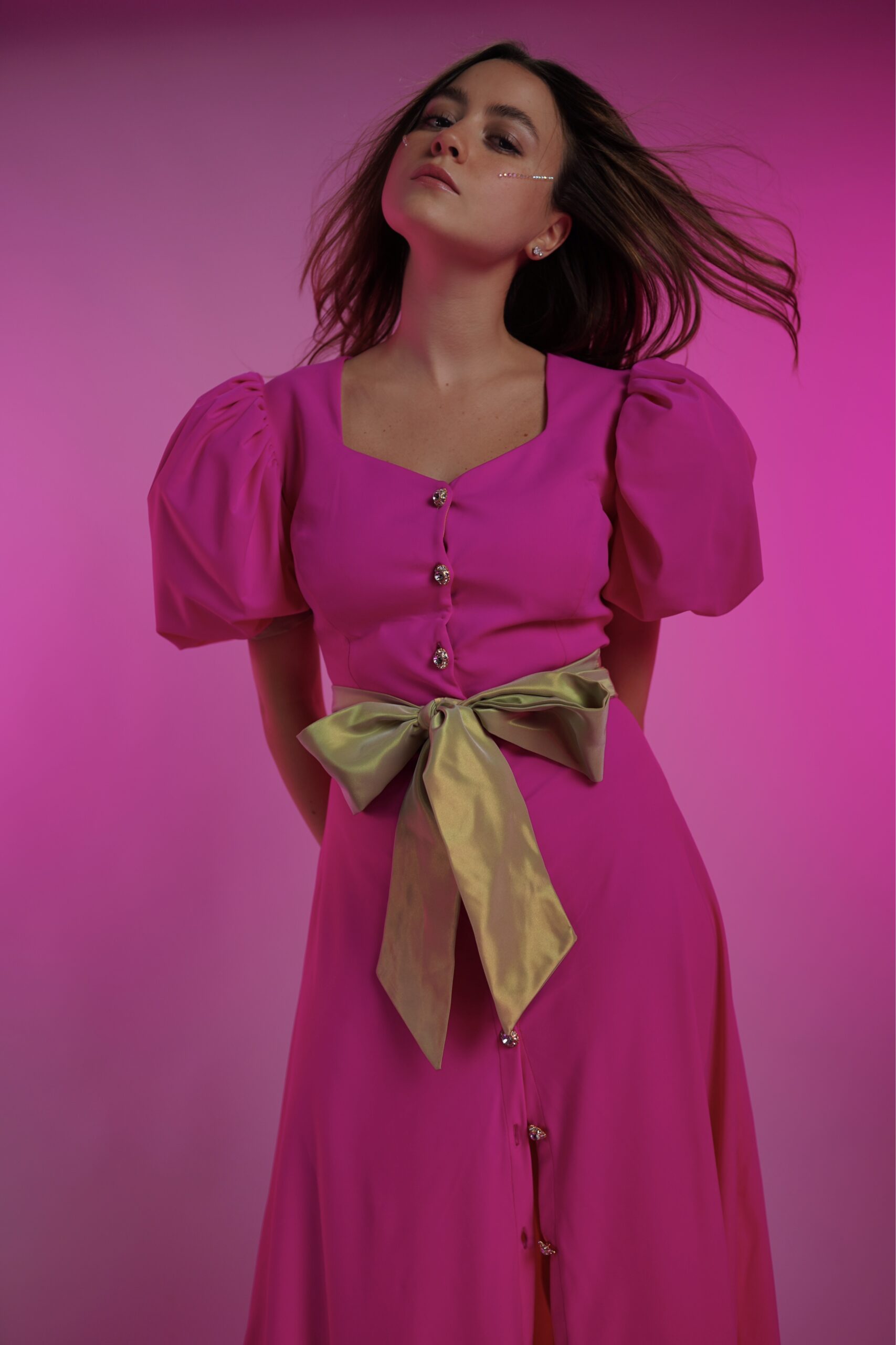 Introducing the enchanting Cinderella dress, reminiscent of a fairytale come to life. This captivating gown features exquisite details, including delicate buttons down the center, charming puff sleeves, and a beautiful ribbon belt, evoking a sense of timeless elegance.