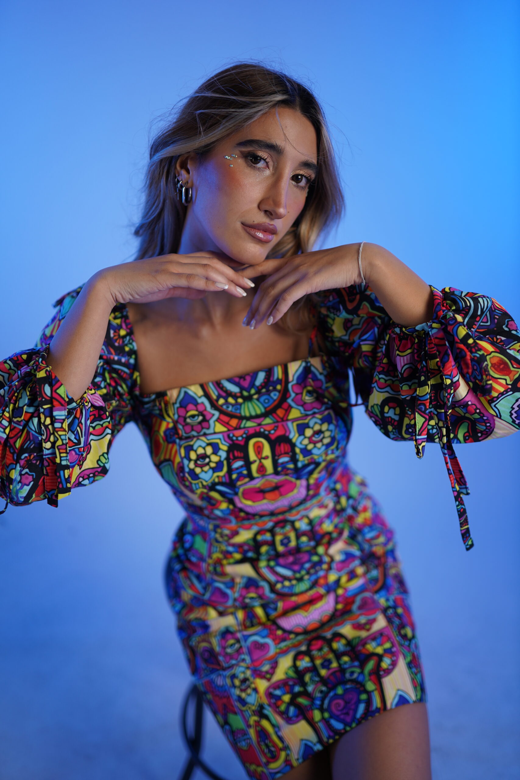 Introducing the delightful candy dress, a whimsical and playful creation that exudes sweetness and charm. This above-the-knee length dress features a back slit for a touch of allure, while the voluminous sleeves adorned with ribbons add a playful and feminine touch.