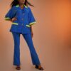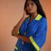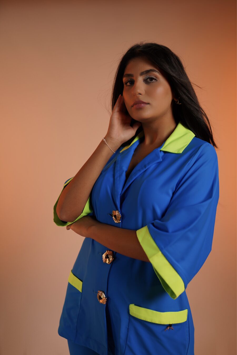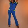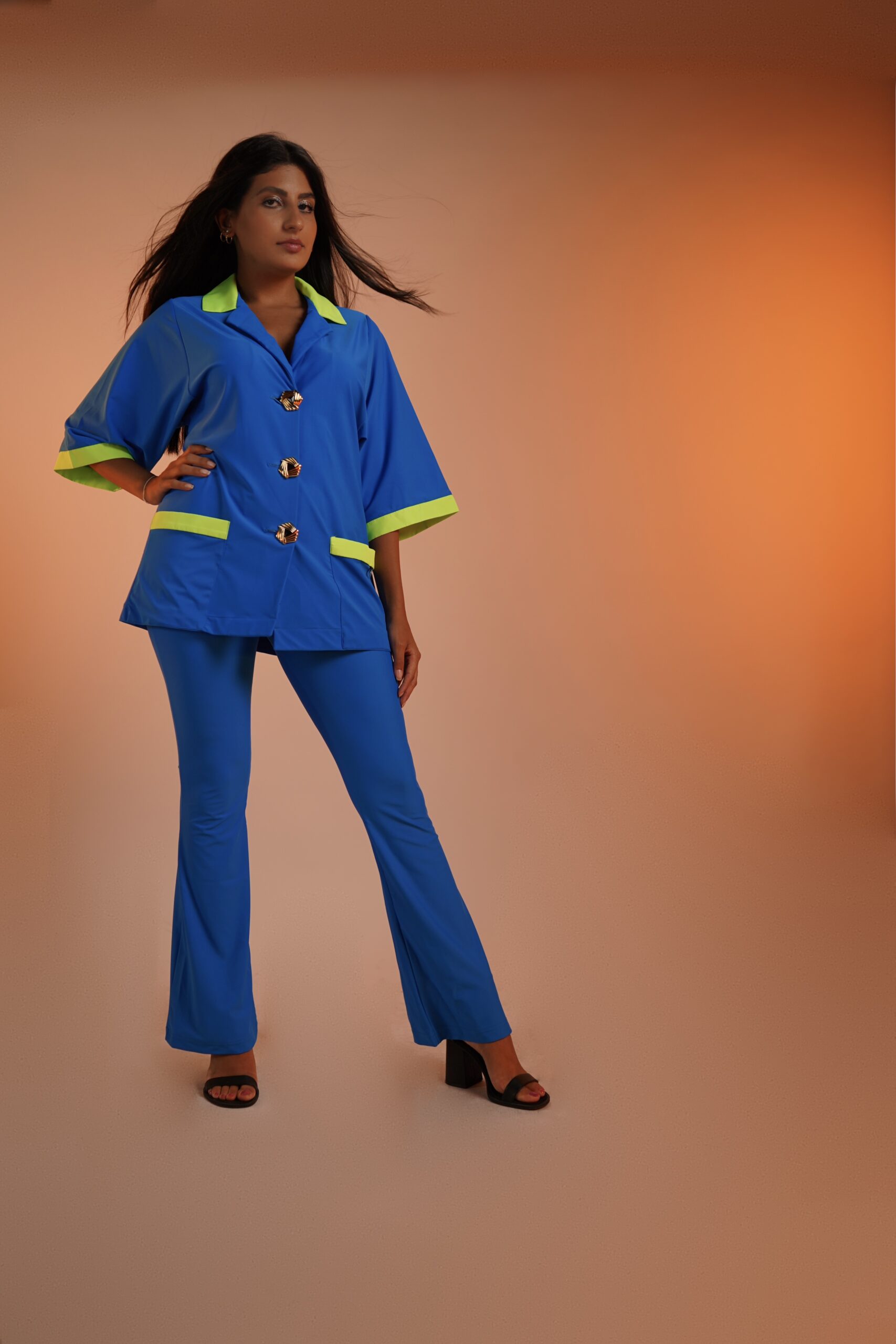 Introducing the fashionable Mandy set, featuring an oversized shirt with black and gold buttons, paired with stretchy pants that are both comfortable and form-fitting. This stylish ensemble effortlessly combines a relaxed yet chic aesthetic, perfect for those seeking a balance between comfort and fashion.